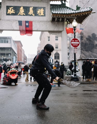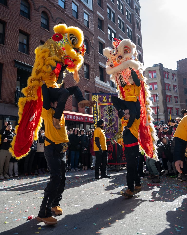 Chinese lion dancing is a traditional form of dance in Chinese culture and other Asian countries where performers mimic a lion's movements in a lion costume. This art form is often seen during Lunar New Year and other significant cultural and religious celebrations, as well as at grand openings, weddings, and special events to scare away evil spirits and bring in good luck and fortune.